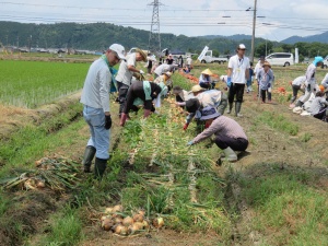 | 大きなネットいっぱいに玉ねぎを詰めていただきました。 「知らない人同士だけれど、いろいろ助けてもらったりして楽しくできた。」など、感想が聞かれました。 |
