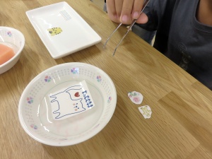 | 去る10月12日、後期第一回目の子ども学び座講座「ポーセラーツ」が実施されました。 陶芸クラブのみなさんのご協力を得てコーヒーカップと角皿に自分の好きなシールを選んで貼り付けました。 どの絵柄のシールを選ぶかが決め手でどの子もたくさんあるシールの中から選択するのに苦労していました。 シールを水につけて取り出し食器に貼り付ける作業はとても繊細で息をこらして静かにそっと貼り付けました。高い温度で焼き上げます。焼き上がりがとても楽しみです |